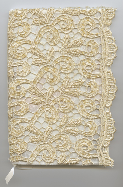 FOR MOM & DAVE © 2014 Lindsey Filowitz embroidered gold lace, Japanese rice paper, printed on rag paper, hand sewn